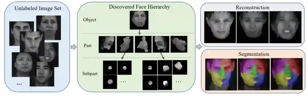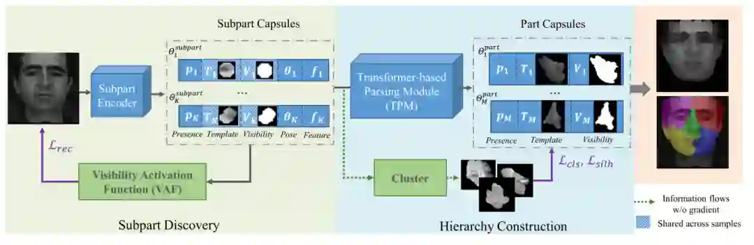 胶囊网络旨在通过一组部件以及部件之间的关系来表征物体,这对视觉感知过程提供了指导。尽管最近的工作证明了胶囊网络在简单对象(如数字)上的成功,但对具有同源结构的人脸的探索仍然不足。在本文中,我们提出了一种层级解析胶囊网络(HP-Capsule),用于无监督的人脸部件发现。在浏览没有标签的大规模人脸图像时,网络首先使用一组可解释的子部分胶囊对经常观察到的模式进行编码。然后,通过基于Transformer 的解析模块 (TPM) 将子部分胶囊组装成部件级胶囊,以学习它们之间的组合关系。在训练过程中,随着人脸层次结构的逐步构建和细化,部件胶囊自适应地对具有语义一致性的人脸部分进行编码。HP-Capsule 将胶囊网络的应用从数字扩展到人脸,并向前迈出了一步,展示了神经网络如何在没有人工干预的情况下理解同源对象。