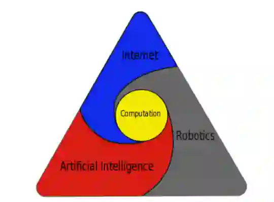 图 1.2:技术三要素--机器人技术、互联网技术和人工智能/移动通信技术影响着非接触式传感器模型堆栈的各个层面,同时也凸显出非接触式传感器的设计和信息流受到每个平台上可用计算能力的重大影响。