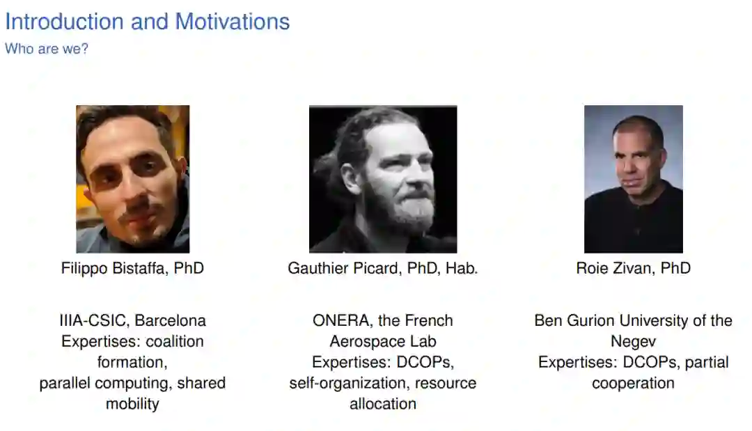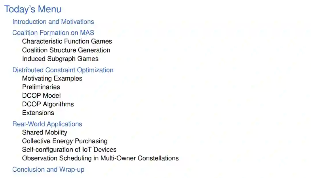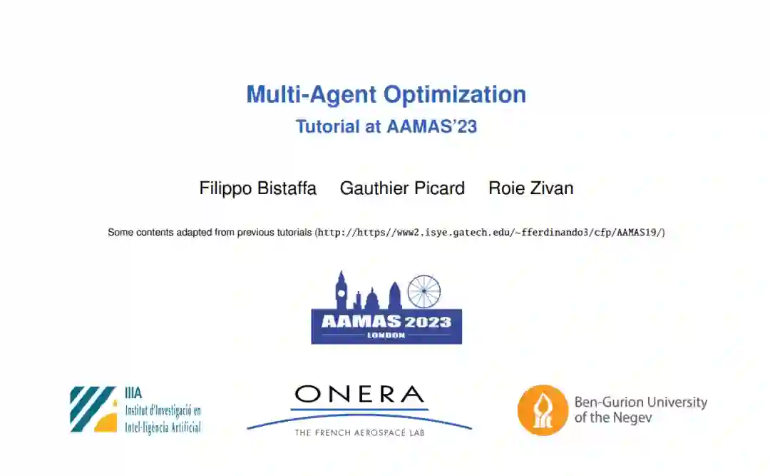 在多智能体系统中,智能体团队通常需要以分布式的方式协调其决策,以实现个体和共享的目标。示例包括面向服务的计算、传感器网络问题以及智能设备在家庭中的协调问题。这样的问题可以用不同的方式来形式化和解决,但总的来说,多智能体协调过程是非平凡的,并且是NP难解的。 在这个关于多智能体优化的教程中,我们将讨论多智能体系统(MAS)文献中提出的两种基本方法来解决协调问题,一种基于分布式约束优化问题(DCOPs)和一种基于联盟形成(CF)。 在第一部分中,我们将提供关于DCOPs的核心概念和模型的可访问和结构化概述。我们还将阐述解决DCOPs的可用最优和次优方法。 在第二部分中,我们将讨论用于模型化MAS的核心概念,即特征函数游戏(CFGs),以及在无约束和有约束CFGs中形成联盟的可用最优和近似方法。我们将通过建立第一部分和第二部分之间的有趣链接来结束这部分,展示如何也可以使用约束优化问题(COPs)来解决CF问题。 最后,我们将邀请参与者对来自实际应用的一些示例问题进行建模,并讨论相关的解决方法。教程将以最常见的挑战和开放性问题作为结论。 https://www.gauthier-picard.info/dcop-tutorial/#outline-short-description