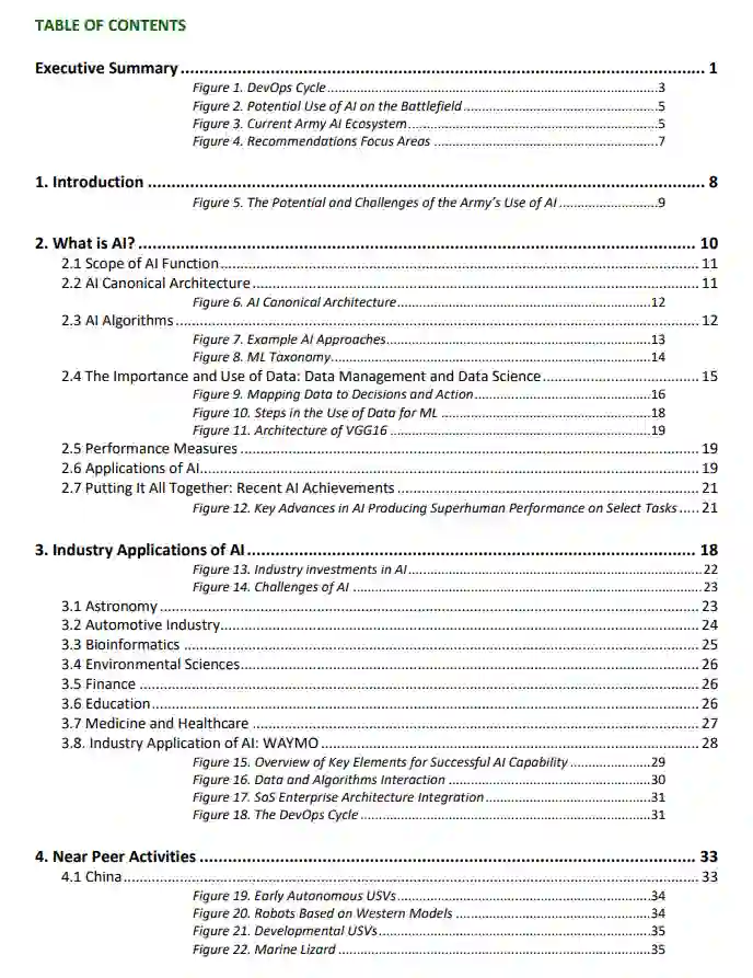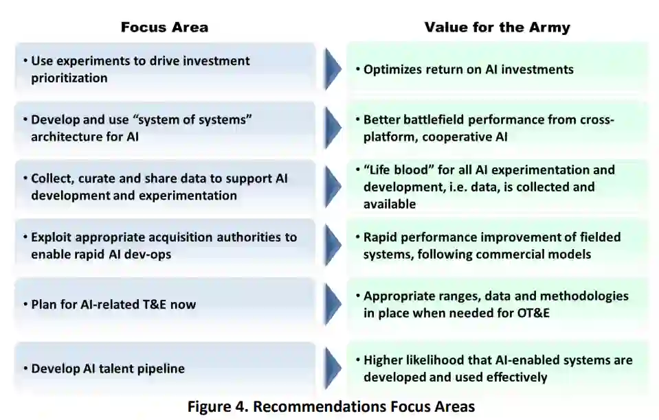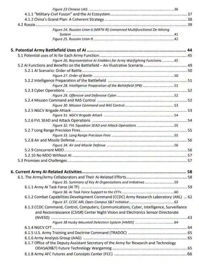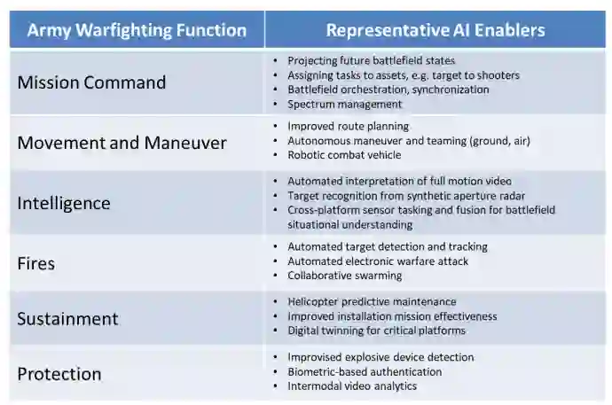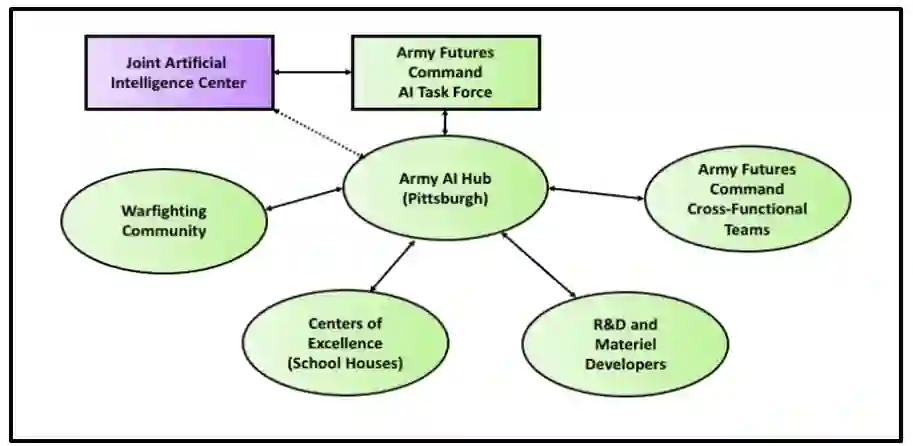 在收集数据的过程中,研究小组了解到,陆军已经开始组织将人工智能带到战场上。陆军成立了人工智能工作组,并与卡内基梅隆大学(CMU)合作成立了陆军人工智能中心。陆军也已经开始在陆军未来和概念中心、训练和条令司令部(TRADOC)以及其他地方开发人工智能的概念。
