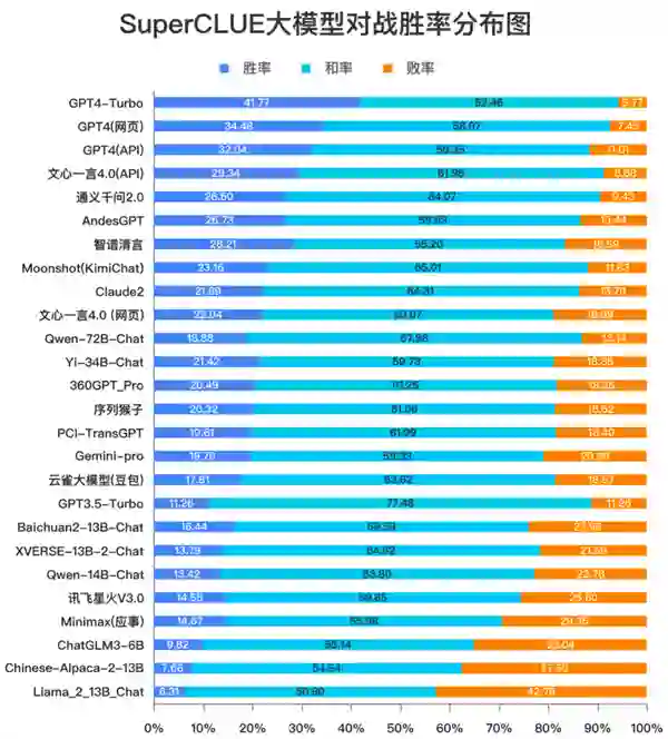 来源:SuperCLUE 曾经取得过SuperCLUE月榜首位的大模型有6个。分别是文心一言、BlueLM、SenseChat3.0、Baichuan2-13B-Chat、360智脑。其中,百度的文心一言登顶SuperCLUE月榜的次数最多,分别在7月、11月、12月取得了SuperCLUE最好成绩。 我们可以看到,在国内大模型技术发展初期阶段,各家大模型公司都投入了巨大的人力、算力和数据资源,以至于每个月测评结果的前三甲都不同程度的变化,经常会因为新发布的高质量模型引起榜单的变化。预计未来一年同样会发生类似的情况。也非常期待有高质量模型能够持续保持非常高的水准。 6. 大模型对战胜率分布图 从胜率来看,全球领跑者GPT4-Turbo胜率为41.77%,和率为52.46%,大幅领先于其他模型,而败率仅为5.77%,足以说明GPT4-Turbo对GPT3.5在各项能力上的全面压倒性优势。而国内模型中,百度的文心一言4.0胜率国内最高,接近30%。胜率超过25%的模型有智谱清言、通义千问2.0和AndesGPT。