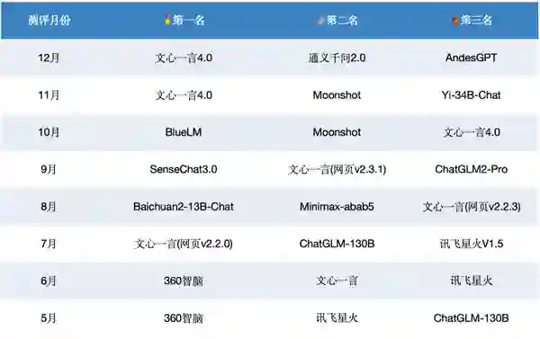 5. 国内大模型历月前三甲 过去八个月国内模型在SuperCLUE基准上的前三名。