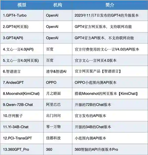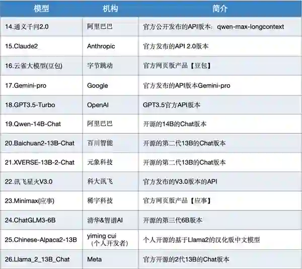 数据来源于SuperCLUE基准得分(7月-12月) 说明: 趋势展示,选取了7月-12月SuperCLUE-OPEN测评分数。国内代表性模型,选取了文心一言、通义千问、ChatGLM。原因是综合考虑了过去半年SuperCLUE测评结果、长期稳定迭代及对国内大模型生态的贡献;GPT4成绩,由GPT4-API(7-9月)与GPT4-Turbo(10-12月)组成,用以表现国外最好模型发展。 大模型综合测评结果 1. 测评模型列表 本次测评数据选取了SuperCLUE-12月测评结果,模型选取了国内外有代表性的26个大模型在12月份的版本。