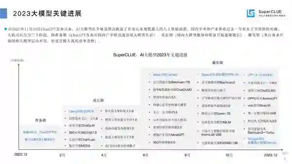 来源:SuperCLUE 自2023年以来,AI大模型在全球范围内掀起了有史以来规模最大的人工智能浪潮。国内学术和产业界在过去一年也有了实质性的突破。中文大模型测评基准SuperCLUE在过去一年对国内外大模型的发展趋势和综合效果进行了实时跟踪。 基于此,我们发布了《中文大模型基准测评2023年度报告》,在AI大模型发展的巨大浪潮中,通过多维度综合性测评,对国内外大模型发展现状进行观察与思考。 国内大模型关键进展