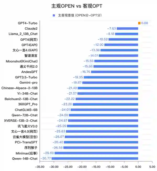 来源:SuperCLUE, 2023年12月28日 在200亿参数量级的开源模型中Baichuan2-13B-Chat的胜率排在首位,展现出不俗的对战能力。排在2至3位的是XVERSE-13B-2-Chat、Qwen-14B-Chat,同样表现可圈可点。 从胜率分布数据可以发现,所有模型的和率都在50%以上。这说明国内外大部分模型在基础题目上与GPT3.5的水平相近,随着任务难度的提升,不同模型的表现才会有区分度。后续的测评数据会在题目难度的区分性和评价颗粒度上加强提升。 7. 主观与客观对比 通过对比模型在主观简答题OPEN和客观选择题OPT上的不同表现,可以发现,国内大模型多数擅长做选择题。普遍选择题的分数会高于简答题的分数。