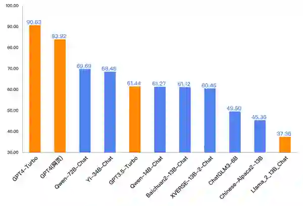注:计算分值为模型的OPEN分与OPT分值的差值,用以观察模型在主观题和客观题上的不同表现。数据来源:SuperCLUE, 2023年12月28日 其中,文心一言4.0和智谱清言表现相对稳定,分别为(-13.38)和(-14.01)。GPT-4 Turbo的表现最为稳定,差值仅有0.86。 SuperCLUE认为,客观题相对主观题更容易通过题库形式进行训练和提升;同时也由于客观题中包含中文特性问题,中文模型自然有一定的优势,所以应该综合来看模型的评测效果。 值得关注的是,在本次测评中,国外的代表性大模型如GPT4的不同版本、Claude2、Llama2都很好的稳定性表现,值得国内大模型进一步分析研究。 8. 开源竞争格局 总体上国内开源模型表现较好,成绩最好的开源模型在中文的某些场景或任务上接近GPT4,其中Qwen-72B-Chat和Yi-34B-Chat总分上已经超过GPT3.5,Baichuan2-13B-Chat也有接近GPT3.5的表现。