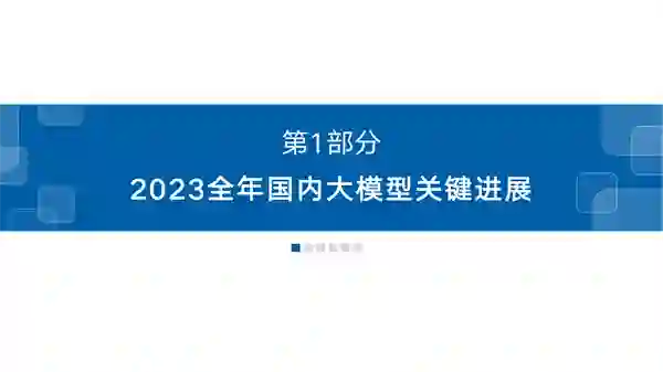 1. 2023年大模型关键进展与中文大模型全景图 国内学术和产业界在过去一年也有了实质性的突破。大致可以分为三个阶段,即准备期(ChatGPT发布后国内产学研迅速形成大模型共识)、成长期(国内大模型数量和质量开始逐渐增长)、爆发期(各行各业开源闭源大模型层出不穷,形成百模大战的竞争态势)。