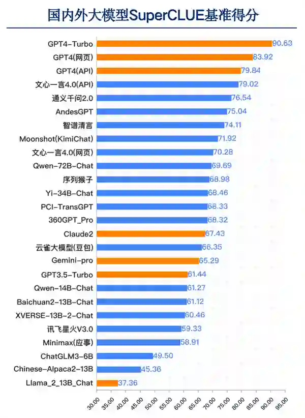来源:SuperCLUE, 2023年12月28日 国内外差距依然明显。GPT4-Turbo总分90.63分遥遥领先,高于其他国内大模型及国外大模型。其中国内最好模型文心一言4.0(API)总分79.02分,距离GPT4-Turbo有11.61分,距离GPT4(网页)有4.9分的差距。 必须看到的是,过去1年国内大模型已经有了长足的进步。综合能力超过GPT3.5和Gemini-Pro的模型有11个,比如百度的文心一言4.0、阿里云的通义千问2.0和Qwen-72B-Chat、OPPO的AndesGPT、清华&智谱AI的智谱清言、字节跳动的云雀大模型等都有比较好的表现。 另外国内开源模型在中文上表现要好于国外开源模型,如百川智能的Baichuan2-13B-Chat、阿里云的Qwen-72B、Yi-34B-Chat均优于Llama2-13B-Chat。 国外模型平均成绩 VS 国内模型平均成绩