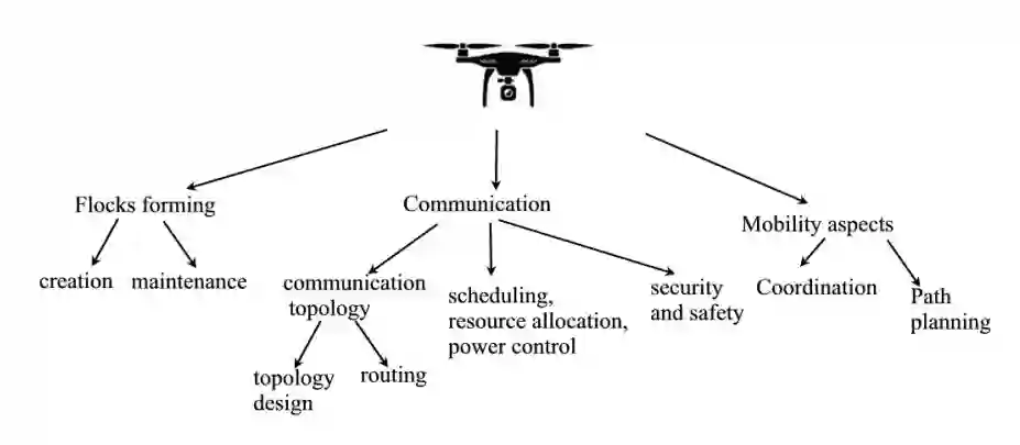 除了前面提到的即使是单架无人机也会遇到的挑战之外,在考虑多架无人机的环境时,也会出现某些任务和问题,在这种环境中,小或大的群体应该一起行动,或应该在相同的空中环境中行动。例如,无人机网络的形成、无人机的聚类与协调、无人机网络中的资源配置等问题需要考虑并有效解决。图1提供了与无人机相关的各种主题的层次描述。