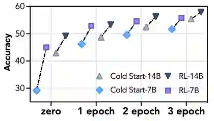 RL能缩小差距,但无法逆转顺序:在不同程度的SFT Cold Start后接入RL,结果表明:RL可以显著缩小不同性能基座模型之间的差距,但最终性能依然与基座模型的初始能力呈正相关。这印证了一个观点:RL的主要作用是激发和调动模型在SFT阶段习得的潜在能力,而非凭空创造新的能力。