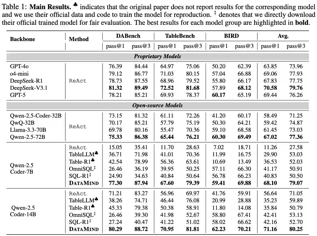 本文三个具有代表性的数据集上对DataMind进行了初步评估:DABench(表格数据分析)、TableBench(复杂表格推理)和BIRD(Text-to-SQL)。对比的基线包括GPT-4o、o4-mini、DeepSeek-R1、DeepSeek-V3.1、GPT-5等闭源模型,以及Llama-3.3、Qwen-2.5系列和专门为数据相关任务微调的TableLLM、OmniSQL等开源模型。