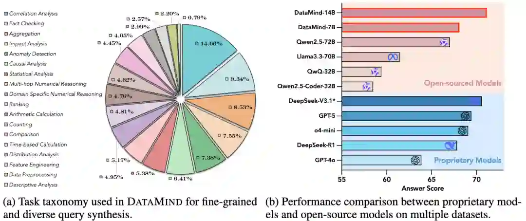 面对这一现状,我们提出了 DataMind,一个可扩展的、面向开源模型的数据合成与智能体训练方案。DataMind 系统性解决了构建开源数据分析智能体的三大核心挑战: