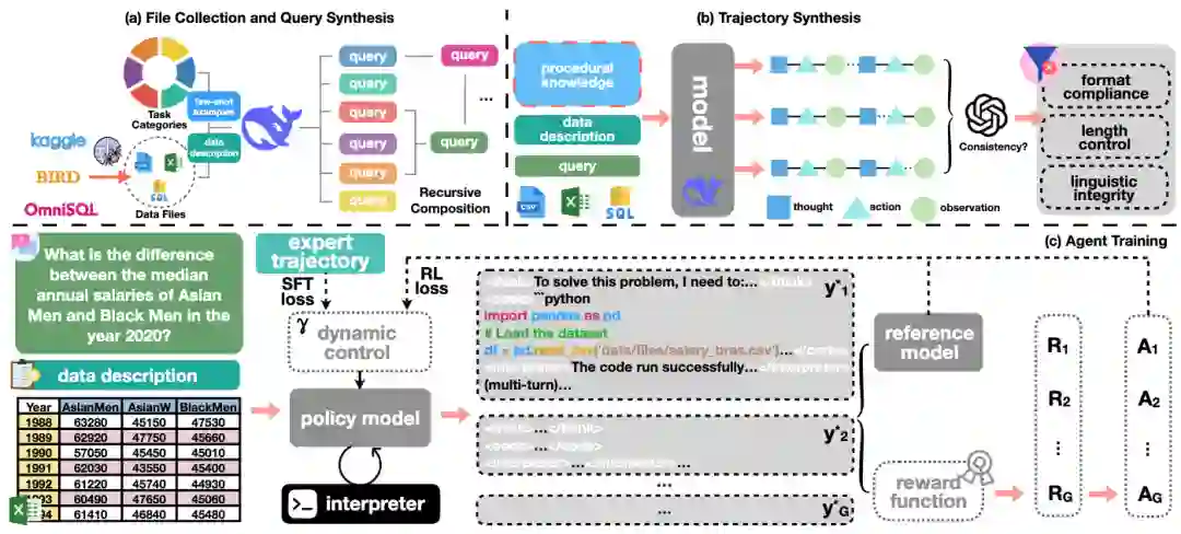 随着大语言模型在数学、代码、科学推理等任务上展现惊人能力,AI正迈入“下半场”——从单纯的对话问答转向解决复杂的、领域特定的智能体任务。其中,数据分析智能体因其在自动化科学研究中的核心地位,成为实现“AI创新”的关键支柱。然而,当前的数据分析智能体大多基于闭源模型,依赖复杂的提示工程或多智能体协作框架,且难以应对真实世界中多样化的数据格式、大规模文件以及长程、多步的复杂推理。
