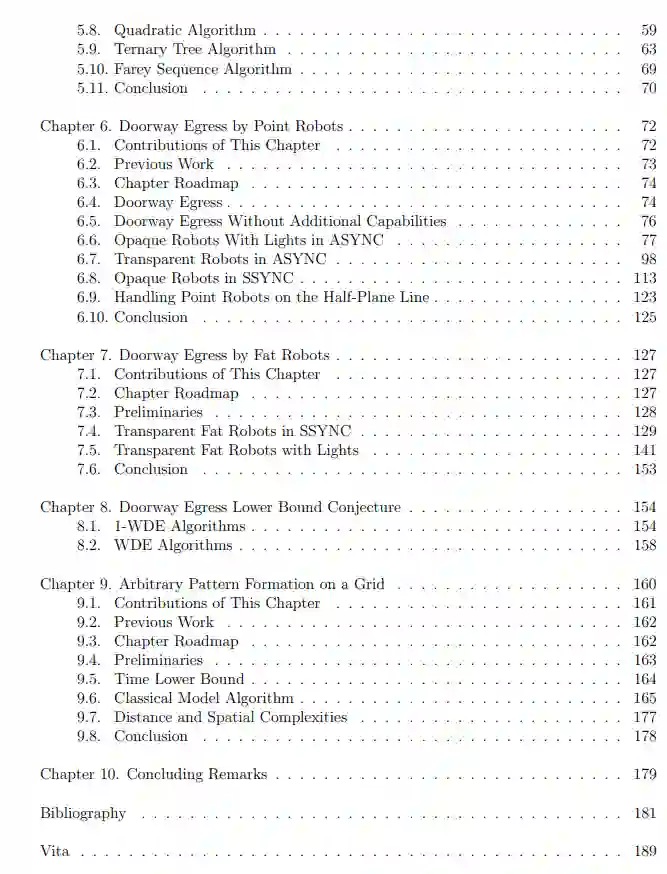将这些指标应用于研究一些著名的重要问题,如完全可见性和任意模式形成。还引入并研究了一个新问题--"门道出口",它抓住了机器人群在受限空间中导航的本质。首先,研究了一类完全可见性算法所使用的距离和空间复杂性。其次,提供了整数平面上的完全可见性算法,包括一些在时间、距离复杂度和空间复杂度方面渐近最优的算法。第三,介绍了门道出口问题,并为各种机器人群模型提供了不同最优性的算法。最后,还提供了网格上任意图案形成的最优算法。