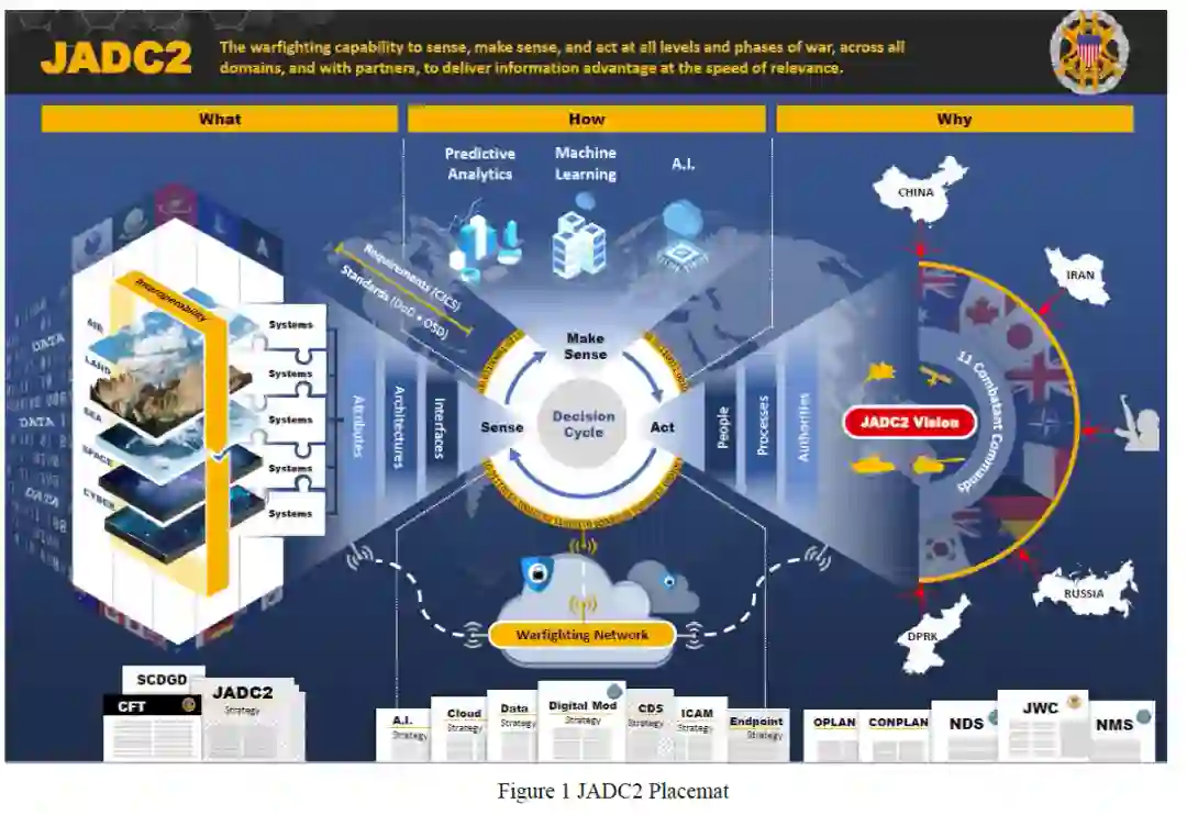 JADC2 战略为识别、组织和提供改进的联合部队指挥和控制 (C2) 能力提供了愿景和方法,并说明了对手已经关闭了其赖以取得作战成功的许多能力和方法优势。作为一种方法,JADC2 支持使用创新技术开发物资和非物资解决方案选项,同时愿意修改现有政策、权力、组织结构和作战程序,从而为联合部队指挥官提供信息和决策优势。