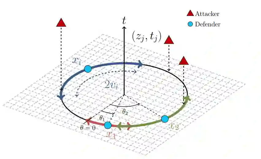一般来说,周界防御问题的解决方案是为一组限制在某一区域周界的智能体寻找策略,这些智能体受托保卫该区域不受试图突破该区域周界的入侵者侵害[16]。