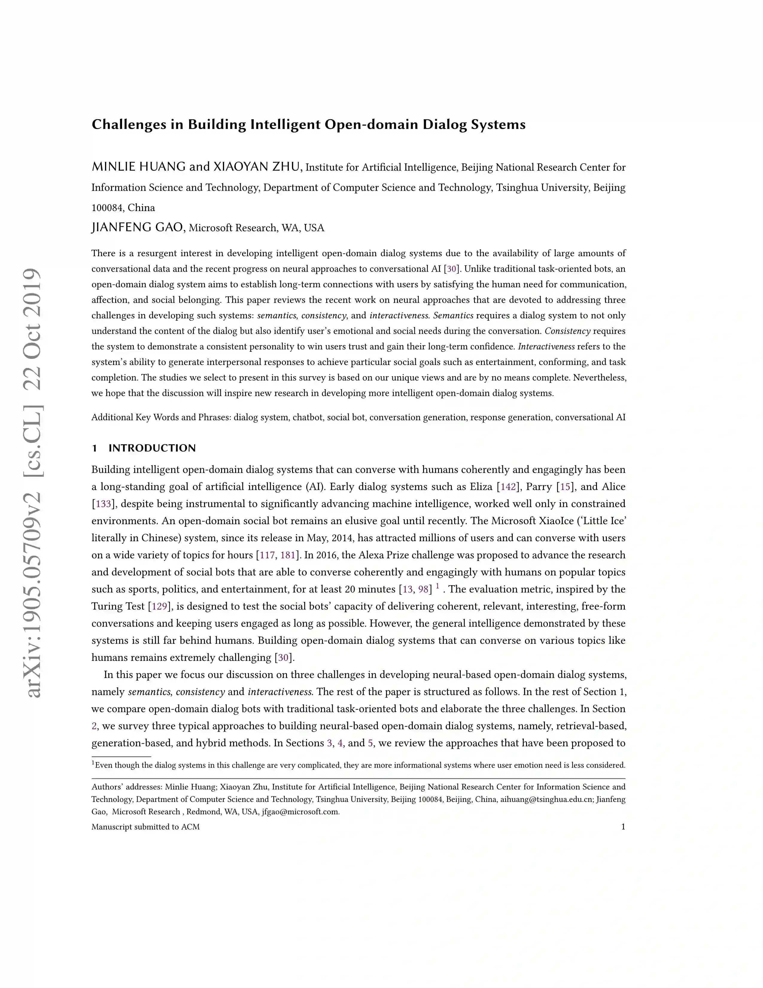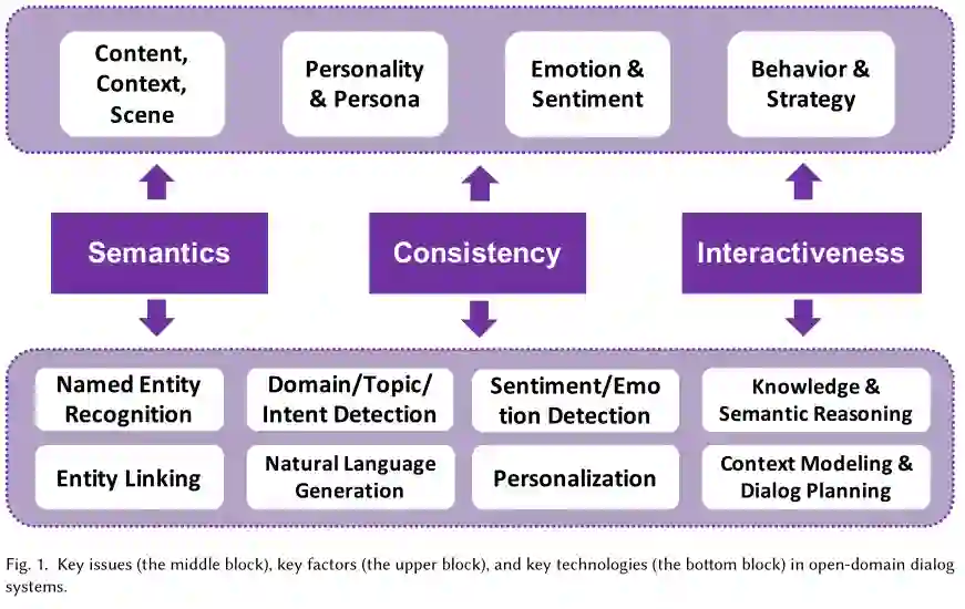 由于大量对话数据的可用性和人工智能对话的神经方法的最新进展,开发智能开放域对话系统的兴趣正在复苏。与传统的面向任务的机器人不同,开放域对话系统旨在通过满足人类交流、情感和社会归属感的需求,与用户建立长期的联系。这篇文章回顾了最近关于神经方法的工作,致力于解决在开发这样的系统中的三个挑战:语义,一致性和交互性。语义要求对话系统不仅要理解对话的内容,还要识别用户在对话过程中的情感和社会需求。一致性要求系统表现出一致的个性,以赢得用户的信任,获得用户的长期信心。互动性是指系统产生人际反应以实现特定社会目标的能力,如娱乐、一致性和任务完成。我们在这次调查中选择的研究是基于我们独特的观点,并不是完全的。尽管如此,我们希望讨论将会给开发更智能的开放域对话系统的新研究带来灵感。