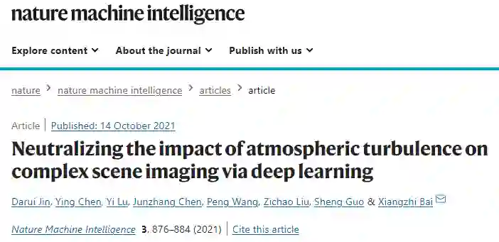 北航白相志教授团队在《Nature》子刊《Nature Machine Intelligence》(2021年第10期)以全文Article形式刊发了最新研究成果“Neutralizing the impact of atmospheric turbulence on complex scene imaging via deep learning”,提出了一种基于多尺度时空域注意力机制的生成对抗网络模型,逆向推理大气湍流效应导致的二维成像退化过程,揭示了深度学习在推演复杂随机物理过程方面的潜力。
