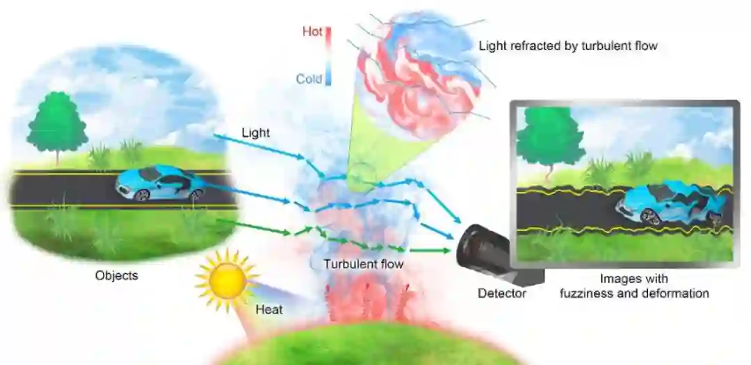 大气湍流效应广泛存在于日常生活和工业生产中。在大雷诺数、惯性力对流场影响为主导的情况下,流体失稳并分化为尺度不一的湍涡,形成湍流。在高分对地观测、远距离成像探测、大范围安防监测等应用中,湍流使得大气折射率随时间和空间作无规则变化,导致光在传输过程中发生强度、相位和方向性波动,最终成像结果包含高度耦合的时变-空变模糊和几何畸变退化(图1)。而湍流的各向异性、不均匀性和不确定性,使得上述退化过程高度病态、高度非线性。因此,对这一物理过程进行逆向推理、抵消成像过程中大气湍流引起的退化效应是一项巨大挑战。