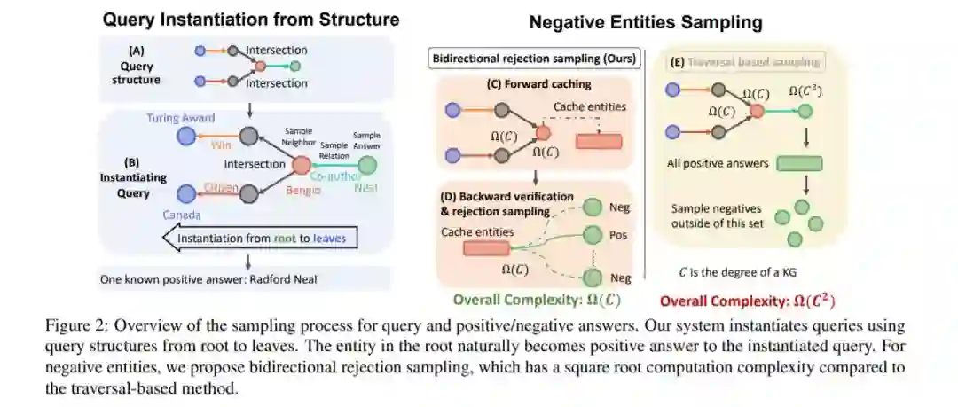 为了应对这些挑战,我们提出了可扩展多跳推理(Scalable MultihOp REasoning, SMORE),这是第一个在大规模KGs上进行单跳和多跳推理的通用框架。在算法方面,关键是在线高效地生成训练实例。为了生成具有一组正实体和负实体的训练示例,我们首先从一组查询逻辑结构(图2(a))实例化给定KG(图2(B))上的查询。实例化查询的根代表一个已知的正(答案)实体。为了获得一组负实体(非答案),简单执行查询计算计划(图1(B)),使用KG遍历(图1(C))来识别正/负实体,其复杂性与查询的跳数呈指数关系。因此,我们提出了一种双向拒绝抽样方法来有效地获取实例化查询的高质量负实体。训练数据采样器的关键思想是通过动态规划确定计算方案的最优节点割(图2(C)中的红色节点),同时进行正向KG遍历(图2(C))和反向验证(图2(D)),从而实现双向拒绝采样。最优切割中的节点缓存前向KG遍历的中间结果;对于向后验证,我们提出正的和负的候选实体,向后遍历最优切割,并基于前向和后向集的重叠执行拒绝抽样。这将最坏情况的复杂性降低了一个平方根,这使得在运行中生成一个训练查询、一个正答案实体和一个负非答案实体是可行的。