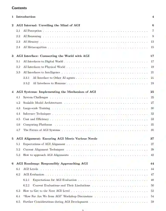 尽管人工智能(AI)给人类社会带来了巨大的进步,但社会日益增长的物质和精神需求使人们对AI仅仅提供的便利感到不满。因此,实现能够更高效、更有效地执行更广泛任务的通用人工智能(AGI)成为了一个紧迫的问题,这被用于描述在大多数任务上至少与人类一样有能力的AI系统(Wang et al., 2018; Voss and Jovanovic, 2023)。因此,我们的论文旨在引起对以下紧迫研究问题的关注:我们距离AGI有多远,以及我们如何负责任地实现AGI?