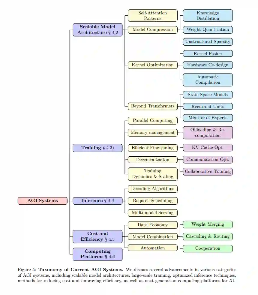 许多大型模型(如Llama 2 (Touvron et al., 2023)、GPT-4 (OpenAI, 2023a)、Gemini (Team et al., 2023)、Claude 3 (AI, 2024) 和 Mistral (Jiang et al., 2023d))在参数数量扩展到一定程度时会表现出一些新兴行为(Wei et al., 2022a)。支持这种扩展并在保持LLMs足够效率的同时实现其工作的关键在于一系列系统工作:1)可扩展的模型架构从根本上和算法上定义了计算和建模;2)大规模训练技术优化了更多硬件加速器的利用,可能分布在地理上;3)推理基础设施确保了多模型的稳定和高吞吐量服务;4)成本和效率讨论了在数据、模型组合和自动化过程中的各种高效方法;最后我们触及了一些关于5)硬件计算平台的方面,这些平台试图突破软物理限制,从而为未来算法创新提供下一代计算能力和硬件基础。 系统研究的进展对于促进这种可扩展性至关重要,这一趋势预计在我们迈向通用人工智能的过程中仍将是关键。随着AI系统研究和工程的不断改进,我们可以预见,模型将在云端的数万个异构加速器上进行训练,这不仅将多个智能体连接成一个多功能综合体,还将为人们的日常生活提供即时和个性化的帮助。 在本节中,我们首先讨论AGI系统需要解决的主要挑战,并介绍一些在模型架构创新、训练、推理、成本降低和计算平台方面的前期努力。最后,我们将总结对未来AGI系统的展望及其在未来中的作用。