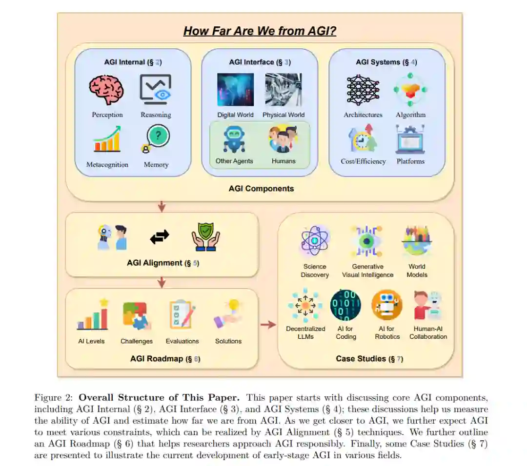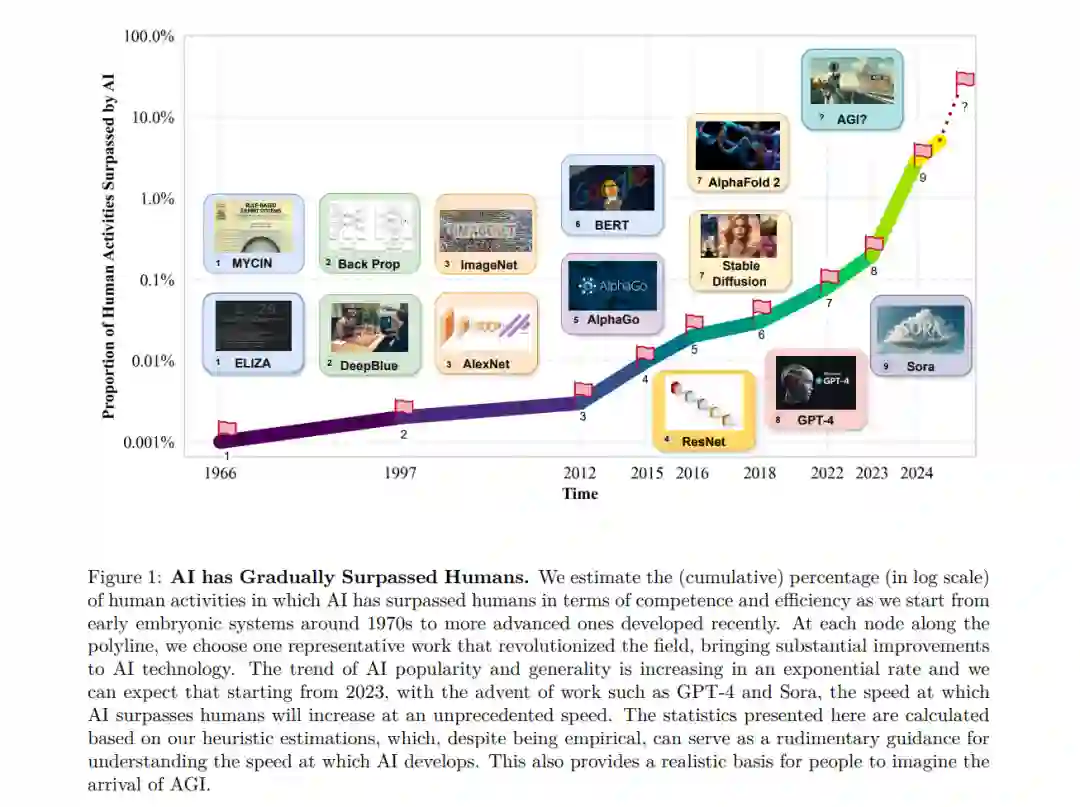 如图1所示,AI的快速发展使其能力在越来越多的领域超越人类活动,这表明AGI的实现越来越接近。因此,重新审视我们距离AGI有多远以及如何负责任地实现AGI这一问题,通过进行一项全面的综述,明确未来AGI的预期并详细阐述当前AI发展的差距,具有重要的现实意义。