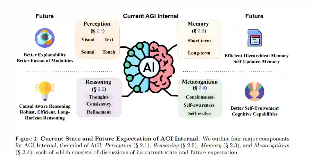 人脑的复杂性,其特定功能区域专注于不同的认知和行为方面,为AGI系统的架构提供了一个引人注目的类比。类似于人脑划分为感觉处理、情感、认知和执行功能的区域,AGI系统的“头脑”也可以被基本组织为四个主要组成部分:感知、记忆、推理能力和元认知。这些组成部分反映了人类认知的基本方面,并在创建一个真正智能的系统中扮演不同的重要角色。我们在图3中总结了本节的概述,展示了AGI内部的现状和未来预期。