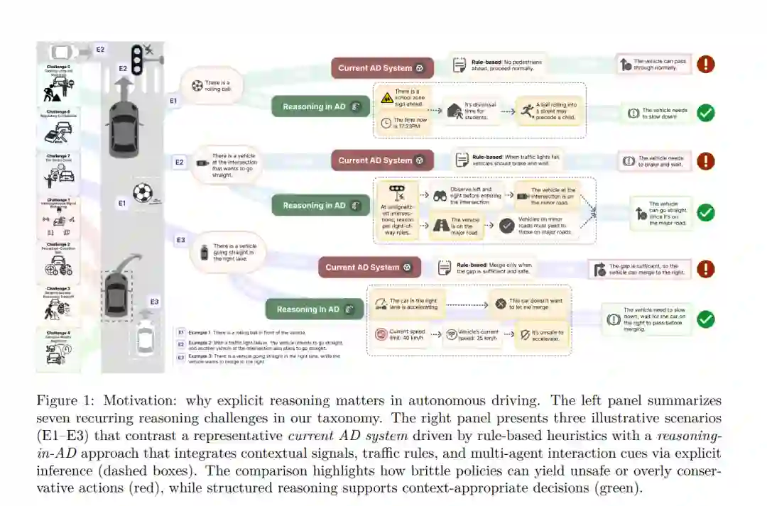 “眼中所见,皆为心之所备。”——罗伯逊·戴维斯 (1952) 自动驾驶(Autonomous Driving, AD)旨在构建一个更安全、更高效、更普惠的交通系统 (Muhammad et al., 2020)。当前,自动驾驶系统的主要瓶颈正从感知与控制系统的物理局限,转向鲁棒且具泛化能力的推理能力的缺失。这一挑战在需要复杂情境理解和常识的场景中尤为突出,例如应对临时交通管制 (Ghosh et al., 2024) 或补偿感知系统的性能衰减 (Matos et al., 2025)。然而,将推理能力集成至 AD 系统中仍是一个尚未充分探索的领域 (Plebe et al., 2024)。为弥合这一鸿沟,本文全面审视了将大语言模型与多模态模型(LLMs 和 MLLMs)作为“认知引擎”的集成方案,以解决 AD 系统中的推理缺陷。 对于 AD 系统而言,核心且亟待解决的挑战是实现从感知到推理的跨越,特别是针对大规模现实世界的部署 (Chen et al., 2021)。正如 Waymo 和 Cruise 所报告的,AD 面临的更深层次挑战在于缺乏高级推理能力,表现为“规划偏差”和“预测偏差” (Boggs et al., 2020)。随着硬件的发展,瓶颈已不再在于感知能力,而在于缺乏统一的推理框架 (Chen et al., 2021; Mahmood & Szabolcsi, 2025; Xu & Sankar, 2024)。因此,当前 AD 的首要目标是开发一种内聚的认知架构,使这些独立组件之间能够实现高级推理。 所幸,LLMs 和 MLLMs 展现出了卓越的推理能力,为解决 AD 推理瓶颈提供了极具前景的方案。通过大规模数据的预训练,这些模型表现出强大的涌现推理能力 (Webb, 2023; Yin et al., 2024),并能进一步利用丰富的常识库进行复杂的情境评估 (Zhang et al., 2024a; Wei et al., 2024b)。尽管其内部机制与人类认知有本质不同,但它们能有效模拟审慎的思维过程,从而弥补 AD 的推理短板 (Xu et al., 2025b)。如图 1 所示,推理能力使 AD 系统能够在挑战性场景中做出恰当反应。例如,当球滚向街道时,具备此类推理能力的系统可以推断出可能会有孩子随后跑出,从而促使车辆预先减速。这种具备概率性、情境感知特征的推理能力,对于应对现实环境固有的不可预测性至关重要;其作为新型认知架构的巨大潜力,正是本文进行系统性综述的动力所在。 为了系统分析推理在自动驾驶中的核心作用,并为后续讨论奠定清晰基础,本综述做出以下主要贡献: * 阐明 AD 的核心推理缺陷:我们系统地将“推理集成”定位为下一代自主系统的核心且未决挑战。不同于泛化的“AI 在驾驶中应用”的综述,我们专门阐述了为何基于 LLM 的推理对于克服已记录的现实失败案例(如错误处理新型施工区域或误读人类社交信号)至关重要,从而为本综述奠定专注的研究基石。 * 提出新型驾驶认知分层架构:我们提出了一个新的概念框架,根据认知与交互复杂度对单一的驾驶任务进行解构。该层级结构包含三个不同的水平:(1)感觉运动层(车辆-环境),(2)自我中心推理层(车辆-智能体),以及(3)社会认知层(车辆-社会)。该框架为分析各层所需的推理能力提供了规范的方法论。 * 构建核心推理挑战的新分类法:基于认知分层,我们推导并系统化了阻碍基于 LLM 的推理在 AD 中部署的七大关键挑战。我们的框架允许分析这些挑战(如“响应性-推理权衡”、“社交博弈”)在不同认知层级中的优先级分布,为研究界提供了结构化的问域空间。 * 前沿技术的双重维度分类与分析:我们通过对“智能体”及其“验证”进行区分,对当前研究进行了结构化分析。我们从两个互补视角探索该领域:(1)以系统为中心的方法和(2)以评估为中心的实践。我们的分析揭示了向整体化、可解释的“玻璃盒”智能体演进的清晰趋势,但同时也指出了在验证其实时安全性与社会合规性方面存在的关键短板。