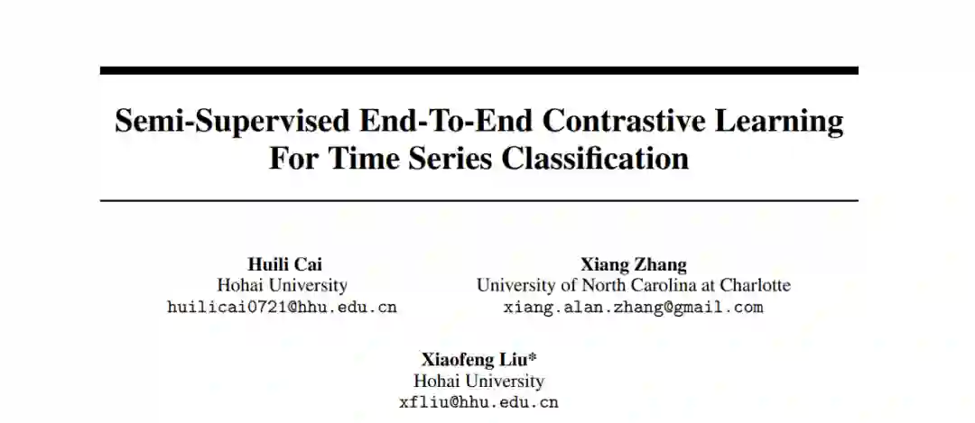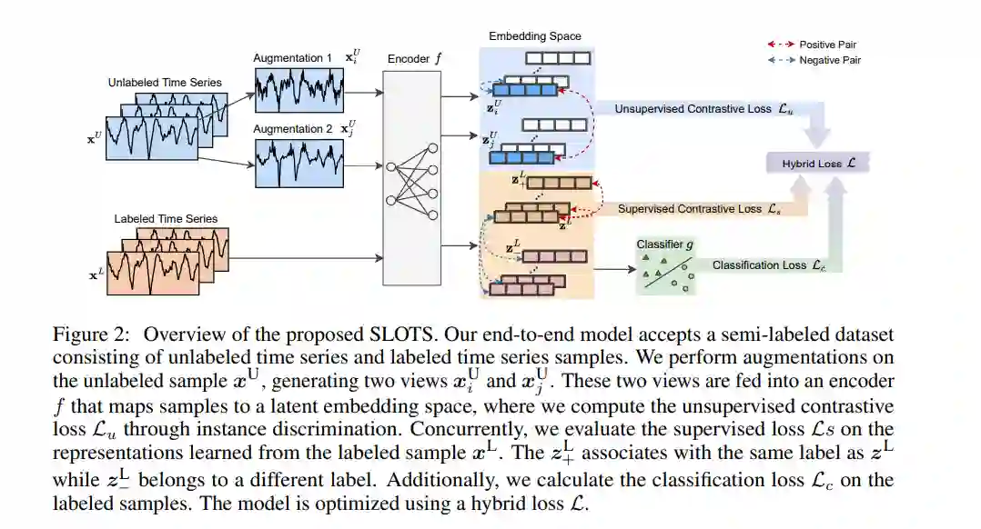 时间序列分类在金融、医疗和传感器数据分析等多个领域都是一个关键任务。无监督的对比学习在从标签有限的时间序列数据中学习有效表示方面引起了广泛关注。现有的对比学习方法中普遍的方法包括两个独立的阶段:在无标签数据集上预训练编码器,然后在小规模有标签数据集上对经过良好训练的模型进行微调。然而,这种两阶段方法存在几个缺点,例如:无监督预训练对比损失不能直接影响下游的微调分类器,以及缺乏利用由有价值的真实标签指导的分类损失。在本文中,我们提出了一个名为SLOTS(半监督时间分类学习)的端到端模型。SLOTS接收半标签数据集,其中包含大量的无标签样本和少量的有标签样本,并通过编码器将它们映射到一个嵌入空间。我们不仅计算无监督的对比损失,而且在具有真实标签的样本上测量有监督的对比损失。学到的嵌入被送入一个分类器,并使用可用的真实标签计算分类损失。无监督、有监督对比损失和分类损失被联合用来优化编码器和分类器。我们通过与五个数据集上的十种最先进方法进行比较来评估SLOTS。结果表明,与两阶段框架相比,我们的端到端SLOTS使用相同的输入数据,消耗类似的计算成本,但提供了明显优化的性能。我们在 https://anonymous.4open.science/r/SLOTS-242E 发布了代码和数据集。