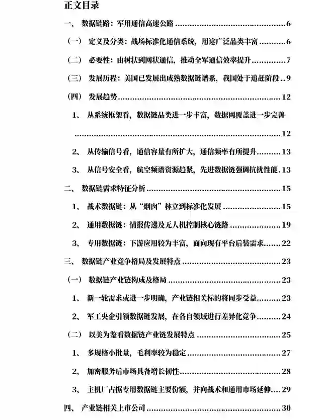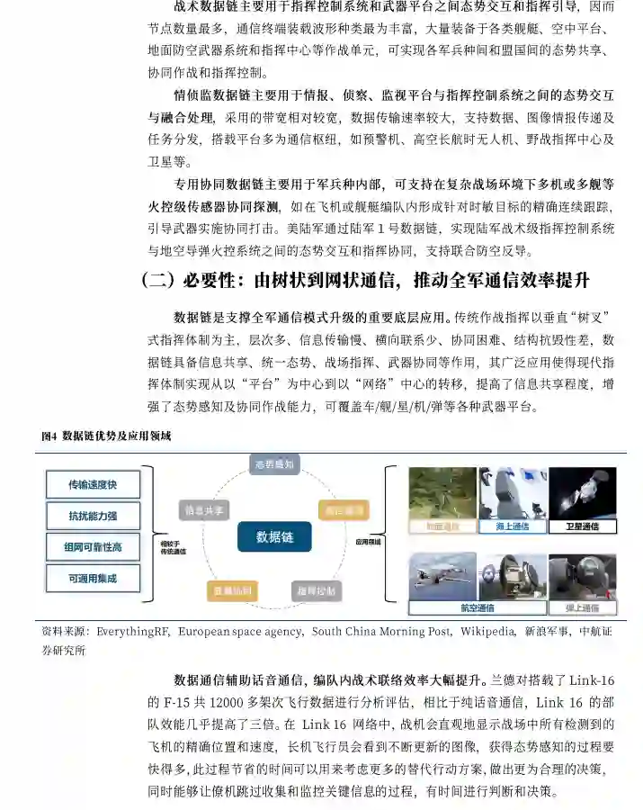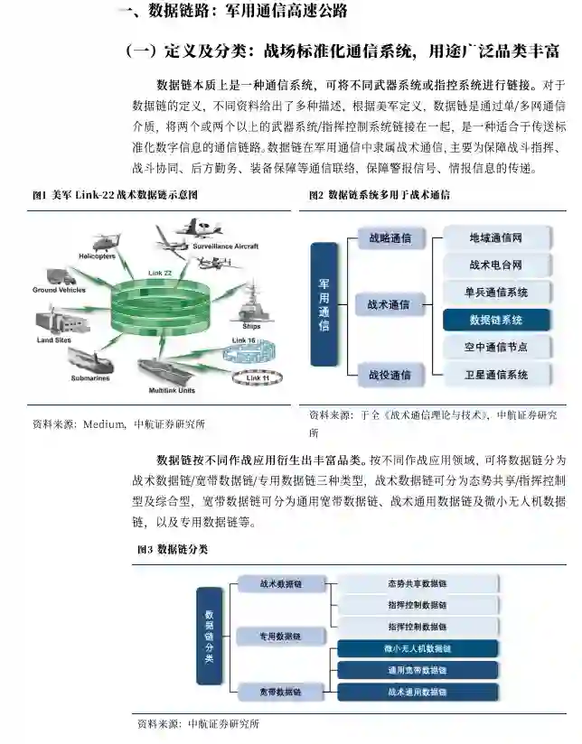 军用数据链是作战数据传输的关键,是武器装备的神经系统,也是打赢未来信息化联合作战的基石,决定着整个作战体系的作战效能乃至作战成败。军用数据链本质上是一种通信系统,可实现不同武器装备系统或指控系统间高速标准化通讯。在信息规范上,数据链对消息格式进行了专门定义,在传输链路上,数据链实现了终端复用和传输提速。在俄乌战场上,乌方借助北约通用数据链弥补预警指挥平台不足的劣势,使其作战部队实现网络化作战,形成了强大协同作战能力。 对于军事装备来说,如果说雷达是眼睛,指挥系统是大脑,武器装备是肌肉,那么数据链就是将“眼睛”、“大脑”和“肌肉”相互连接起来的“神经”,而现代战争中信息化、智能化的“神经网络”则需要更快、更多、更宽的数据链路,以实现作战装备和决策中心的高效链接,依靠数据链构建数字化战场,才能达成真正意义上的协同化、智能化作战,大力建设全军互联互通数据链是实现联合作战的必由之路,是形成新质战斗力的必要举措。 “十四五”进入攻坚阶段,可以预见迎面而来的“十五五”,军事信息化将深入推进,军事智能化有望大放异彩。我们判断,国防建设将实现从聚焦硬实力到关注软实力的切换,数据链作为整合未来军队作战力量的黏合剂,将充分受益于新质作战装备建设及存量装备渗透率的提升。相关行业及业内公司正逐步显示出其内在价值,行业公司有望实现业绩的稳定、快速增长,赢得长期溢价。
