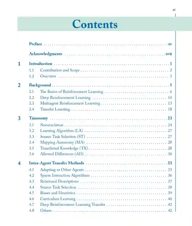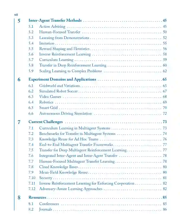 本书概述了多agent RL中关于知识重用的文献。作者为重用知识定义了最先进的解决方案的统一分类,提供了该领域最近进展的全面讨论。在这本书中,读者将发现关于知识在多智能体顺序决策任务中重用的许多方法的全面讨论,以及在哪些场景中每种方法更有效。作者还提供了他们对该地区目前低垂的发展成果的看法,以及仍然开放的大问题,可能导致突破性的发展。最后,本书为想要加入这一领域或利用这些技术的研究人员提供了资源,包括会议、期刊和实现工具的列表。