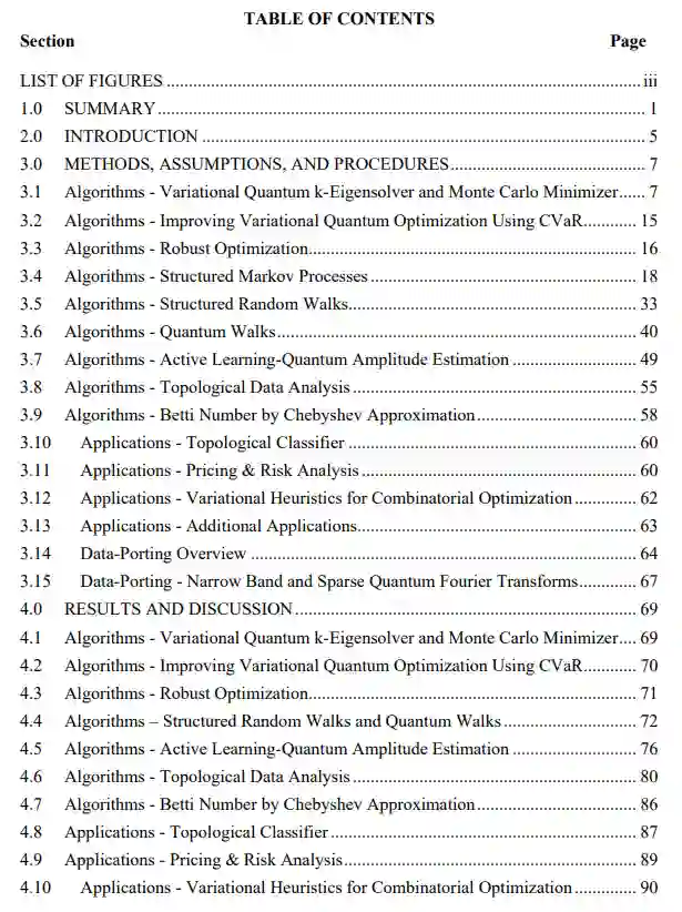 在量子计算吸引人的应用领域中,我们发现了拓扑数据分析,特别是持久同源性领域,可以考虑大幅度(达到指数级)加速。追踪贝蒂数如何随着尺度𝞮的变化而变化,揭示了在不同的𝞮分析数据时,拓扑特征是如何产生和消失的。在许多长度尺度上持续存在的拓扑学特征可以被识别为结构化的"真正"特征:持续性同源性。在第3.8节中,我们提供了理论基础,并涵盖了诸如边界图、链复合体、同源组和复合滤波以及BarCodes等主题。在此之前,我们报告了重要的实现细节,特别是受控的变换操作的设计和实现。在此期间,我们开发了一种新的快速量子算法来计算基于切比雪夫多项式近似的贝蒂数。该方法只需要计算矩阵矩,而不需要计算矩阵的特征分解(使用QPE)。我们提出了许多数值结果,表明新方法在估计贝蒂数方面非常有效。
