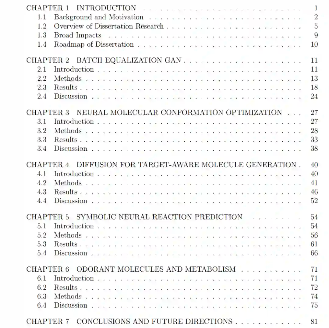 **数字化、大规模和高通量技术的出现产生了前所未有的数据,为今天的药物发现利用机器学习(ML)提供了一个极好的机会。**通过识别ML中的相关问题和合适配置,我们可以将这些不断增加的数据转化为发现更好的药物,并缩短药物开发周期,从而为以前无法治愈的疾病提供更便宜的药物和治疗选择。**本文提出了四种机器学习方法来解决当今药物研发流程中的不同挑战,以快速为临床试验提供更可行的药物候选,并最终改善所有人的生活质量。**本文提出一种批均衡方法,利用风格迁移生成对抗网络来调节细胞图像中常见的批效果,以便可以更有效地将它们用于高通量体外筛选。描述了一个能量启发的SE(3)等变模型,以高效和准确地估计分子构象的分布,从而可以提高基于硅结构的筛选的准确性。提出了一个用于目标感知分子生成的3D全原子扩散框架,可以探索现有筛选库之外的新化学,并提出新的药物候选以结合挑战性疾病的靶点。描述了一种反应预测算法,将基于规则的系统(整数线性规划)和数据驱动的方法(图神经网络)结合在一起,可以从所描述的筛选管道或生成模型中有效地合成候选药物。最后,我们使用图神经网络对气味分子(而不是药物)进行建模,并找到许多物种共享的通用气味空间。我们假设,新陈代谢的生物学驱动了这种趋同进化,我们对这些与不同代谢过程相关的挥发性有机化合物的建模能力,可能对我们如何理解动物嗅觉和研究人类健康有很大的影响。综上所述,本文展示了机器学习在大数据时代改变药物发现和人类健康的潜力。