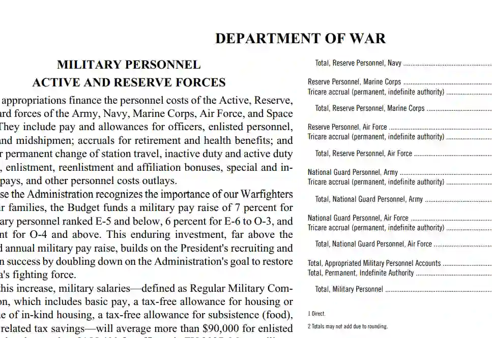 预算为所有E-5及以下级别军事人员提供7%的加薪,E-6至O-3级别加薪6%,O-4及以上级别加薪5%。