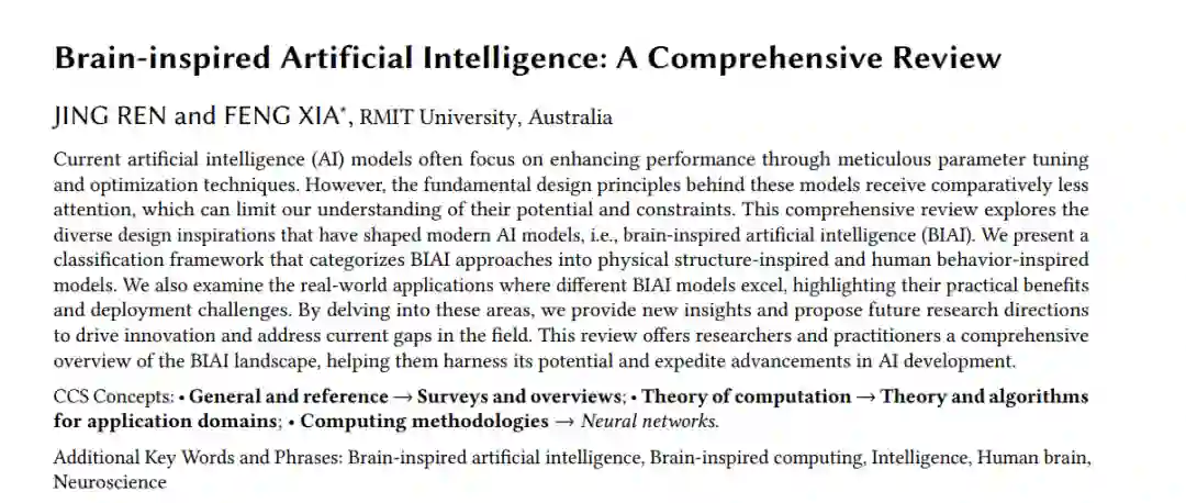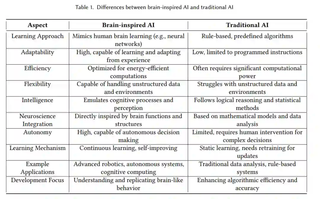 人工智能(AI)的一个基本目标是创造能够像人类一样学习和思考的机器。为了实现这一目标,人工学习器在多个领域中取得了显著的里程碑,包括目标和语音识别【131, 151】、图像处理【115】、机器人技术【50】、医学数据分析【161】、自然语言处理(NLP)【114】等。这些成功加速了AI的发展,使其在某些领域能够与人类匹敌甚至超越。例如,AI模型现在在某些特定任务中表现优于人类,如语言翻译【134】、图像识别【63】甚至战略游戏如国际象棋和围棋【155】。最近,许多公司提出了一系列能够理解图像、音频、视频和文本的多模态模型,其能力类似于人类【3, 7, 169】。这种快速的进步彰显了AI在各个领域中的变革潜力,推动了技术能实现的边界。然而,旨在创造具有类似人类思维和推理能力的机器的一般AI方法在可扩展性、鲁棒性、能效、可解释性、学习效率和适应性方面仍然存在局限性【98】。 人类大脑被认为是最复杂的信息处理系统,能够解决诸如学习、推理和感知等复杂任务。基于对人脑研究的最新进展,研究人员正在将神经科学的见解整合到AI系统中,旨在开发能够更接近人类行为的感知、推理和行动的脑启发人工智能(BIAI)系统【128, 163】。这一努力源于对生物智能的基本原理的理解,并希望利用这些原理来构建更智能、适应性更强和更鲁棒的AI系统。什么是脑启发人工智能(BIAI)?BIAI指的是从人类大脑和神经系统的生物结构、功能和原理中获得灵感的AI系统和算法。它专注于复制或模仿生物体中观察到的复杂过程和功能,以在人工系统中实现更类似于人类或大脑的行为【197】。与一般AI算法相比,BIAI通常集中于人类行为的特定方面,如从经验中学习、适应新环境以及关注重要信息。在这篇全面综述中,BIAI文献大致分为物理结构(PS)启发型模型和人类行为(HB)启发型模型。PS启发型模型是指模仿生物神经元、突触和神经回路结构的模型,用于执行诸如学习、推理和决策等任务。代表性模型包括多层感知器(MLP)、人工神经网络(ANNs)以及最近的脉冲神经网络(SNNs)。HB启发型模型被定义为复制人类行为中观察到的生物机制和过程的模型。这些模型旨在捕捉生物系统的动态,同时提供对人类如何感知、学习、适应和与环境互动的见解。注意力机制、迁移学习和强化学习是常见的人类行为启发的深度学习方法。BIAI与一般AI的区别在于它们在AI领域中的不同方法和目标【31, 77】。具体而言,一般AI并不一定受到人类大脑具体工作方式的启发,而是旨在更广泛的意义上达到或甚至超越人类水平的智能。相反,设计BIAI系统的目的是复制或模仿人类认知背后的生物机制和过程。这些系统通常在图像识别和机器人控制等任务中表现出色,但它们可能不具备人类智能的全方位能力。BIAI与传统AI的更全面比较见表1。为什么BIAI重要?BIAI的重要性主要体现在两个方面。一方面,BIAI在适应性、泛化能力和可解释性等许多方面有潜力超越传统的AI方法。另一方面,BIAI模型旨在模仿大脑的结构和功能,从而增加其生物学的合理性。这种与生物学原理的契合不仅加深了我们对智能的科学理解,也为神经科学和AI研究之间的合作创造了新的机会。本质上,通过从人类大脑——最先进的信息处理系统——中汲取灵感,研究人员正在为开发可能达到甚至超越人类能力的智能系统奠定基础【47, 103, 125】。