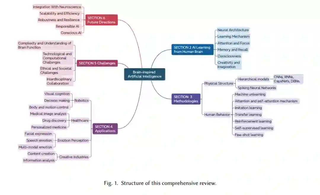 之前的研究涵盖了脑启发/类脑学习或计算范围内的类似主题【62, 74, 132, 149】,但没有一篇集中探讨神经科学为AI模型带来的具体知识,也没有全面详细地介绍BIAI系统。在【132】中,作者试图总结脑启发算法在智能机器人中的进展,深入探讨了视觉认知、情感调节决策、肌肉骨骼机器人技术和运动控制等关键领域。Ou等人【122】介绍了类脑计算模型和芯片、它们的演变历史、常见应用场景和未来前景。Hassabis等人【62】探讨了AI与神经科学之间的历史联系,并研究了受人类和其他动物神经计算研究启发的AI的最新进展。在【106】中,作者展示了机器学习和神经网络如何改变动物行为和神经成像研究领域。关于人工神经网络中的脑启发学习,可以在【149】中找到生物学基础和算法介绍。这篇综述主要集中在如何从人类大脑的物理结构中学习。然而,没有一篇综述注意到并审视了受人类行为和学习机制启发的AI模型。此外,他们也未全面讨论AI可以从人类大脑和神经系统中学习哪些部分来设计模型。在本综述中,我们主要回答以下问题:什么是BIAI?BIAI与一般AI有什么区别?BIAI能为我们带来哪些优势?我们可以从人类大脑的哪些角度来设计AI模型?哪些BIAI模型已经在现实世界中使用?引入BIAI可以进一步推动哪些研究领域?当将神经科学与AI模型相结合时,研究人员面临哪些挑战?当前BIAI技术中存在哪些差距,未来可以在哪些方面开展工作?通过回答这些问题,我们希望研究人员能够加深对BIAI系统的理解,并提高他们为不同应用设计更合适的BIAI算法的能力。