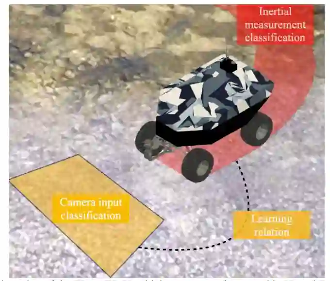 这项工作利用开源工具创建了一个虚拟环境和车辆,与现实世界的条件相比较,以测试、训练和评估不同的机器学习方法。特别是,在自监督的学习策略下,卷积和长短时记忆递归神经网络的结合,避免了大量的标签,并能学习新的模式和地形,特别是影响或限制移动性的模式。在自监督的结构中,LSTM产生连续的结果,提供给CNN。由于摄像机是正面观察,而LSTM只有在实际到达表面时才进行分类,因此该策略需要一种网络配置,使两种类型的数据兼容,以创建一个共同的地图。重新训练的CNN层通过“冻结”特征提取器被传递到在线工作。通过地图运行每个模型,并对结果进行归一化处理以使其具有可比性,显示出针对验证数据不同级别的准确性,这些验证数据分别使用两个网络上的弱标记和完全标记的数据,以及拟议的自监督结构中的组合。这表明单个网络对验证数据的准确率为85.93%,对弱标记数据的准确率为94.61%。由于允许网络使用代表同一类数据的不同来源,所以在组合方法上有更好的结果。