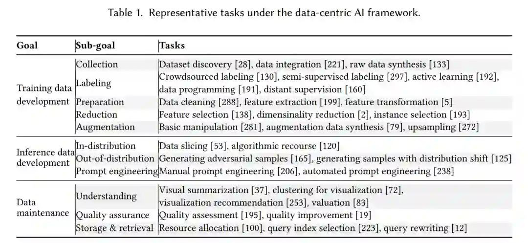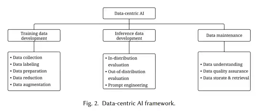人工智能(AI): AI是一个广泛的跨学科领域,它试图使计算机具有人类的智能来解决复杂的任务[252]。人工智能的一个主要技术是机器学习,它利用数据来训练预测模型来完成一些任务。 * 数据: 数据是一个非常通用的概念,用于描述传递信息的值的集合。在人工智能的背景下,数据用于训练机器学习模型或作为模型输入进行预测。数据可以以各种格式出现,如表格数据、图像、文本、音频和视频。 * 训练数据: 训练数据是用于机器学习模型训练阶段的数据。该模型利用训练数据调整参数并进行预测。 * 推理数据: 推理数据是用于机器学习模型推理阶段的数据。一方面,它可以在模型训练后对模型的性能进行评估;另一方面,对推理数据进行调优可以帮助获得所需的输出,例如对语言模型的提示进行调优[146]。 * 数据维护: 数据维护是指维护数据质量和可靠性的过程,通常涉及高效的算法、工具和基础设施,以理解和调试数据。数据维护在人工智能中起着至关重要的作用,因为它确保训练和推理数据的准确性和一致性[107]。 * 以数据为中心的人工智能: 数据为中心的人工智能是指为人工智能系统开发、迭代和维护数据的框架[268]。以数据为中心的人工智能涉及构建有效的训练数据、设计适当的推理数据和维护数据的任务和方法。 对以数据为中心的AI的需求