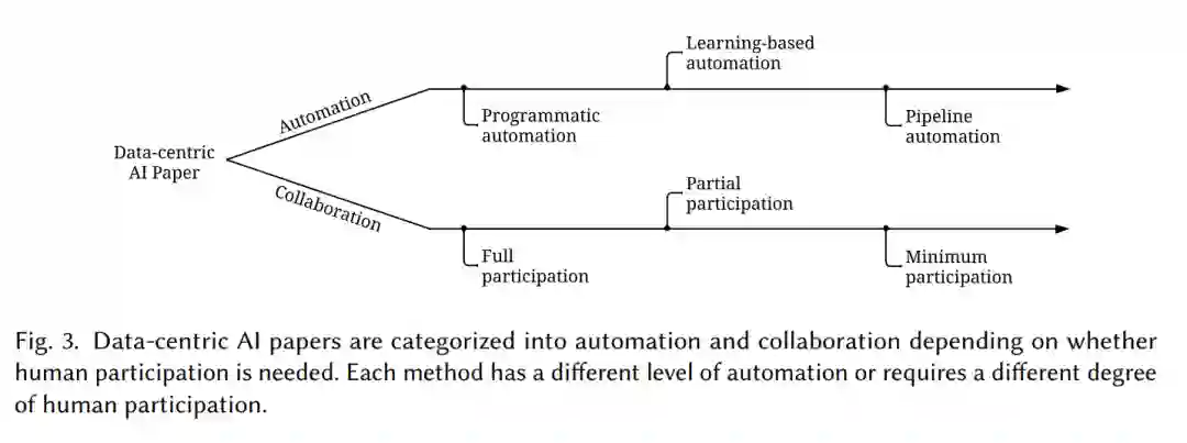 以数据为中心的AI由一系列与不同数据生命周期阶段相关的任务组成。为了跟上可用数据规模不断增长的步伐,在一些以数据为中心的人工智能任务中,开发自动化算法以简化过程是必不可少的。例如,人们对自动化数据增强[56,272]和特征转换[122]的兴趣越来越大。这些任务的自动化不仅可以提高效率,还可以提高精度[155]。此外,自动化可以促进结果的一致性,减少人为错误的机会。而对于其他一些任务,人工参与是至关重要的,以确保数据与我们的意图一致。例如,人类通常在标记数据中发挥不可或缺的作用[283],这有助于机器学习算法学习做出所需的预测。是否需要人类的参与取决于我们的目标是否是使数据与人类的期望保持一致。本文将每篇论文分为自动化和协作,前者侧重于过程自动化,后者涉及人工参与。面向自动化的方法通常具有不同的自动化目标。我们可以从现有的方法中识别出几个自动化级别: