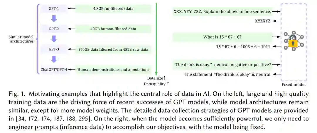 过去的十年见证了人工智能(AI)的巨大进步,几乎在每个领域都产生了深远的影响,如自然语言处理[47]、计算机视觉[235]、推荐系统[284]、医疗保健[161]、生物学[248]、金融[175]等。这些巨大成功的一个关键促成因素是丰富和高质量的数据的可用性。许多重大的人工智能突破只有在我们获得正确的训练数据之后才会发生。例如,AlexNet[127]是第一批成功的卷积神经网络之一,它是基于ImageNet数据集[59]设计的。AlphaFold[117]是人工智能在科学发现方面的一个突破,如果没有注释的蛋白质序列[163],将不可能实现。大型语言模型的最新进展依赖于大型文本数据进行训练34,121,187,188。除了训练数据外,精心设计的推理数据有助于对人工智能中众多关键问题的初步识别,并解锁新的模型能力。一个著名的例子是对抗样本[129],它通过对输入数据的专门修改来混淆神经网络,这引起了人们对研究人工智能安全的兴趣激增。另一个例子是prompt engineering[146],它仅通过调整输入数据来从模型中探测知识,同时保持模型固定(图1右侧)来完成各种任务。与此同时,数据的价值在工业界得到了广泛的认可。许多大型科技公司已经建立了基础设施来组织、理解和调试构建AI系统的数据[7,15,230,233]。在构建训练数据、推理数据和维护数据的基础设施方面的所有努力,为今天人工智能的成就铺平了道路。