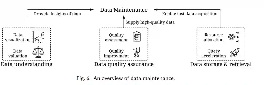 数据维护: 在实际应用中,数据不是一次性创建的,而是需要持续维护的。数据维护的目的是保证动态环境中数据的质量和可靠性。它涉及3个基本的子目标:1)数据理解,旨在提供复杂数据的可视化和评估,使人类获得有价值的见解;2)数据质量保证,制定定量测量和质量改进策略,以监测和修复数据;3)数据加速,旨在设计高效的算法,通过合理分配资源和高效处理查询来提供所需的数据。数据维护在以数据为中心的AI框架中起着基础性和支持性的作用,确保训练和推理中的数据准确和可靠。