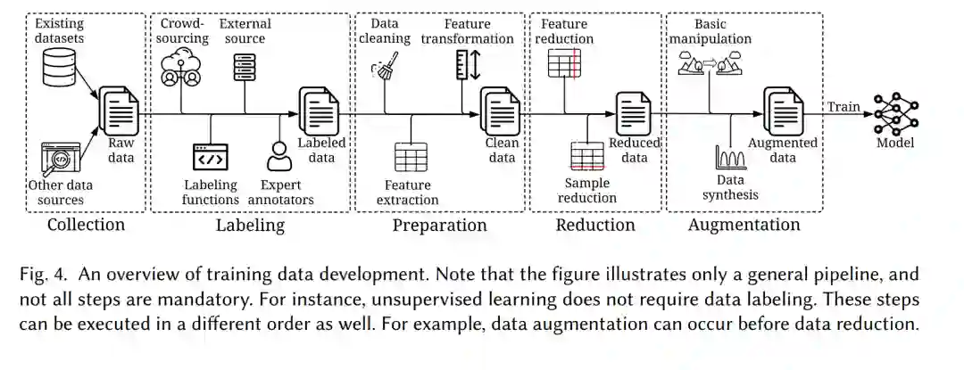 训练数据开发: 训练数据开发的目标是收集和产生丰富且高质量的训练数据,以支持机器学习模型的训练。它由5个子目标组成,包括1)用于收集原始训练数据的数据收集,2)用于添加信息标签的数据标记,3)用于清洗和转换数据的数据准备,4)用于减少数据大小并可能提高性能的数据缩减,以及5)用于增强数据多样性而不收集更多数据的数据增强。