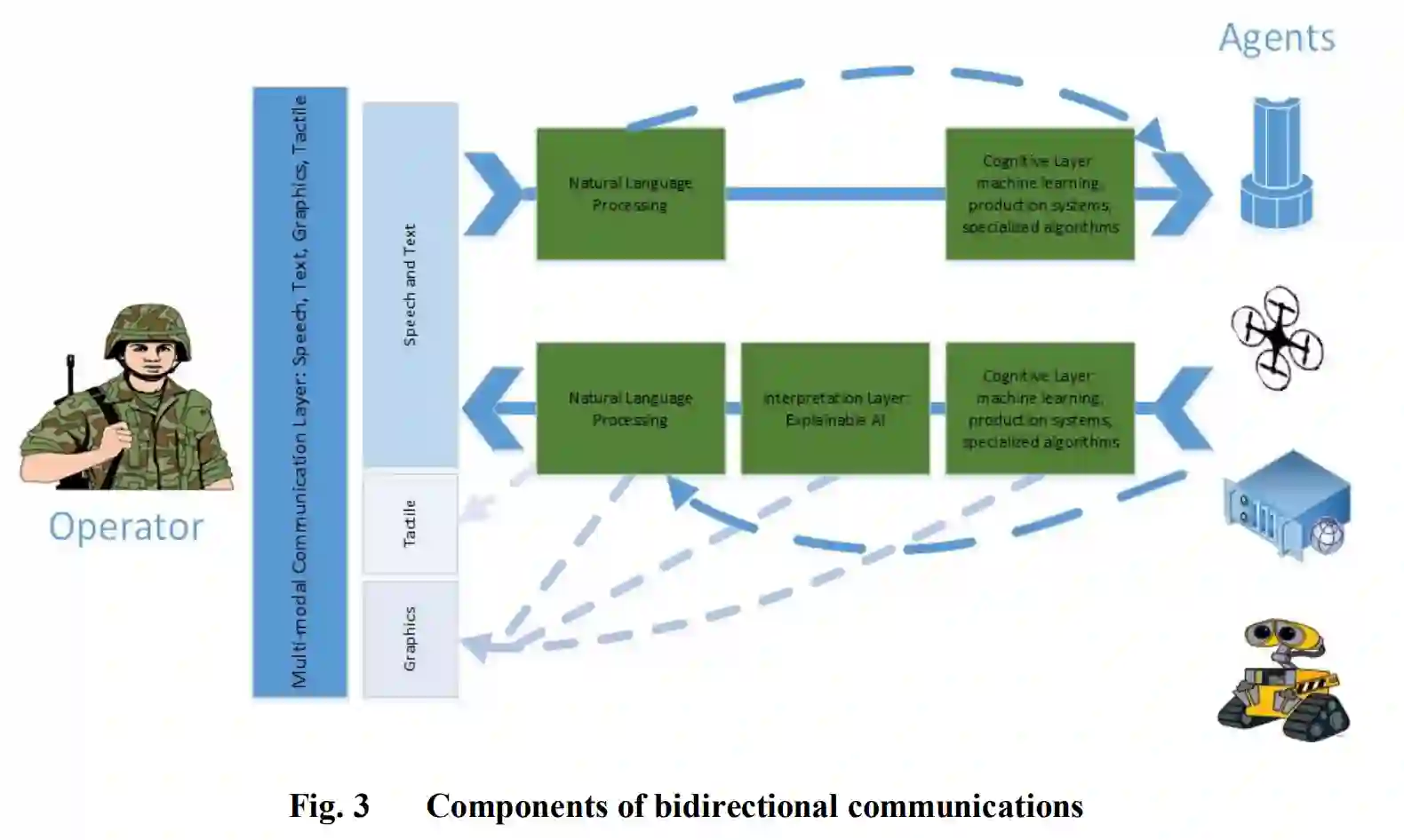 随着IA复杂性的增加,有效通信的必要性也随之增加。Cooke(2015)认为,高效的团队合作关系更多的是取决于有效的互动,而不是拥有广泛的共享知识库。除了有一个共同的语言框架,每个团队成员都必须知道什么时候向他们的伙伴推送信息,什么时候要求提供信息。因此,人类和IA不仅要有任务环境的SA,而且要有彼此角色的SA,以便在没有公开交流的情况下回应伙伴的要求(Scherri等人,2003;Chen等人,2018)。我们讨论三个主要的主题。第一个主题是对人-Agent架构的描述,以及为什么它与人-人团队不同,强调相互透明度的重要性。接下来,我们讨论了人类与人工智能(AI)系统通信所涉及的技术问题,包括多模态交互、语言限制、AI的类型以及可解释AI(XAI)的重要性,以确保相互理解。最后,我们讨论了共享意图的重要性,以促进操作者和人工智能之间信息交互的自然节奏。