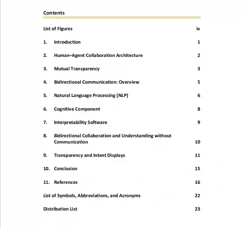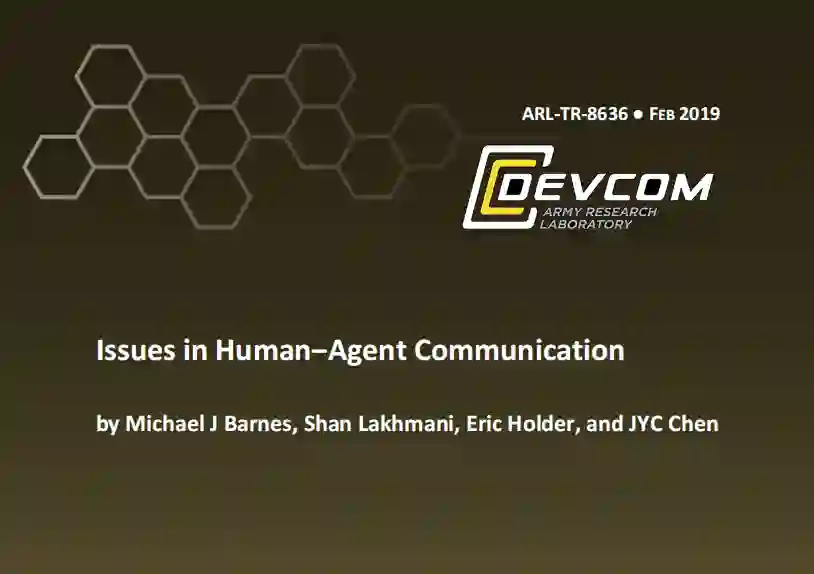 本报告涵盖了与设计评估人类和智能软件Agent之间通信有关的问题,这些通信是实现协作关系所必需的。为了使人与Agent之间的互动在动态的现实世界中保持稳定,软件Agent和人类都必须能够在任务目标方面沟通他们的整体意图。由于推理过程、能力和知识库的不同,人类和Agent并不是人类团队的模拟。我们讨论了有效通信所涉及的技术问题,包括相互透明的模型、自然语言处理(NLP)、人工智能(AI)和可解释的AI。由于缺乏使人类能够洞察其队友心理过程的心智理论,Agent很难预测人类的信息需求和未来行动。涉及多个Agent的协作计划研究和合成共享心智模型的研究被作为尝试将人类和Agent整合成一个协同单位典范。然而,我们的结论是,在人类和Agent在复杂的、不确定的任务中像人类团队一样通信之前,NLP、可解释人工智能和人类科学的进展将是必要的。