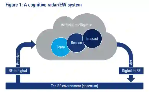 如图1所示,一个认知型射频系统具有感知其环境的能力,在这种情况下,射频频谱和相关能量通过该频谱转换为射频数据流。通过推理和理解数据流的背景,其中可能有不确定因素(如噪音或其他发射器),该系统做出自主判断并确定行动方案,而不需要求助于任何其他系统或人为干预。该行动方案通常是另一个射频I/Q数据流,它被转换回射频频谱。该系统的最终目标是拒绝对手使用射频频谱(电子攻击,EA),保护一个平台,例如通过采用抗干扰技术来保护通信链路(电子保护,EP)和/或向另一个系统传递支持信息(电子支持,ES)。认知系统使用一个连续的反馈回路,包括对情况的感知、学习、推理、互动和行动。该系统从其与射频环境的互动中学习,这就是认知一词的基础,它来自拉丁语动词cognoscere,意思是 "了解、认识、概念、知识"。