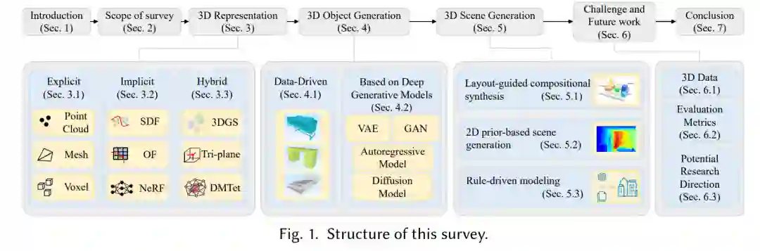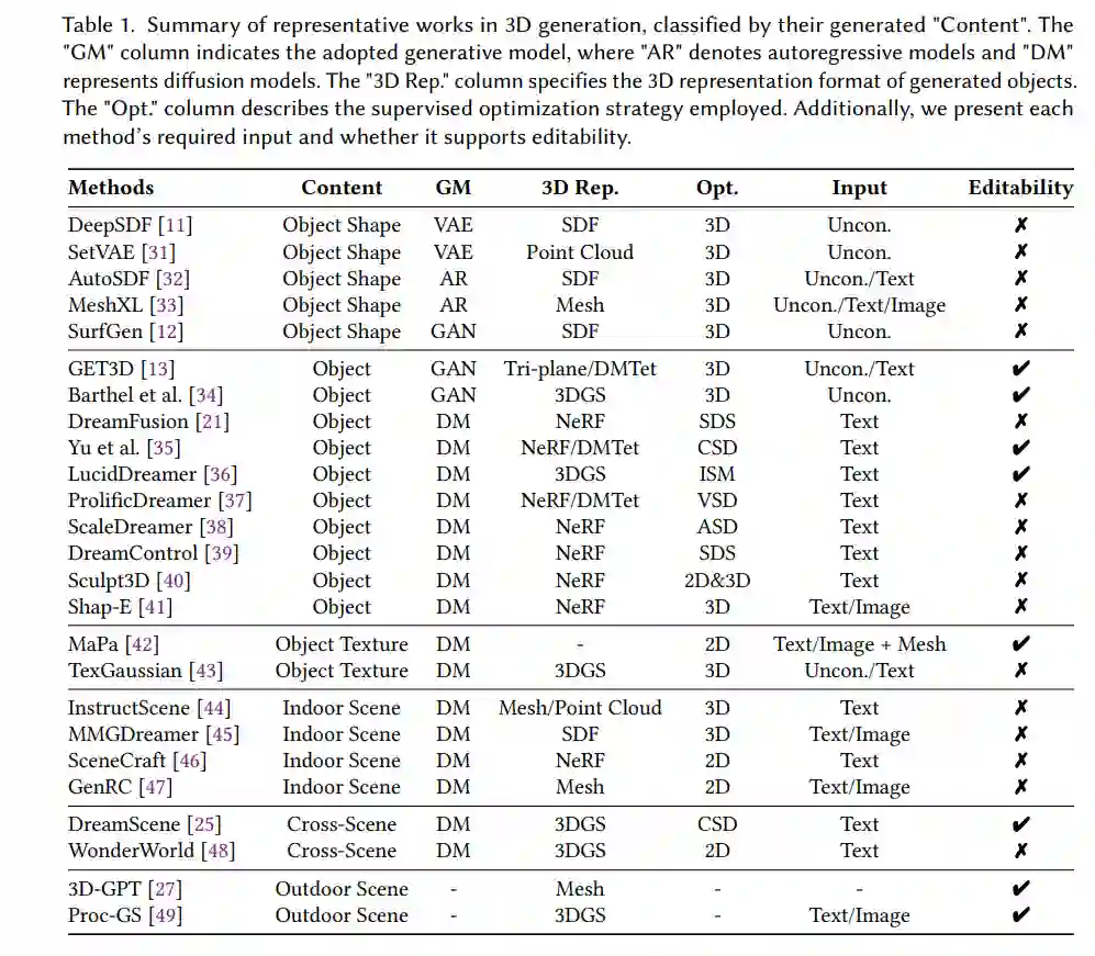 因此,本文旨在系统梳理三维内容生成领域的相关研究,归纳其技术路线并进行分类总结。如表1所示,我们对近年来代表性工作进行了结构化整理,聚焦于三维表示、三维物体与场景的生成方法。 如图1所示,本文在第二节界定研究范围并介绍相关工作;第三节介绍三维表示的基本理论,分析其优势、局限性及与生成框架的融合方式。随后,我们将三维内容生成任务划分为物体级与场景级两个层面。第四节从公开数据集出发,介绍基于数据驱动的生成方法,随后探讨其如何随着深度生成模型的发展,扩展到三维生成领域并形成独特的技术范式。第五节聚焦于场景生成,我们从理论角度将相关方法分为三类:基于布局或场景图的多物体组合生成、基于二维图像空间信息直接提取场景表示的方法,以及具有可控细节的规则驱动建模方法。代表性工作的时间线图分别展示于附录图5与图6中。最后,第六节指出当前领域所面临的关键挑战,并提出未来可能的研究方向。本文希望通过本综述为研究人员提供技术参考,并激发后续的深入探索。 我们的主要贡献可总结如下: