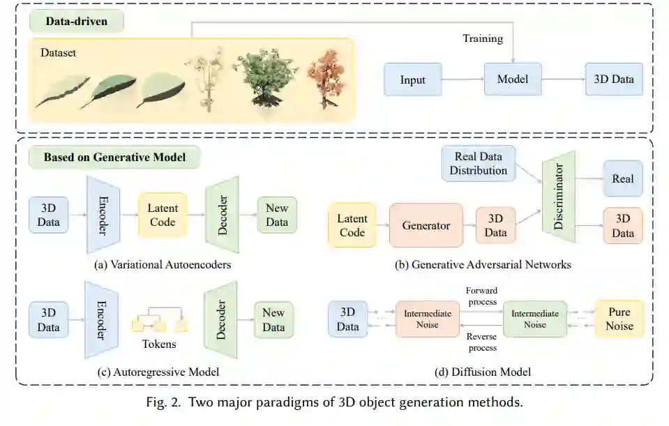 提出了一种新颖的分类方法,将三维内容生成划分为物体生成与场景生成两个子任务,并分别对其技术路径进行了系统性总结与归纳; 全面回顾了近五年内的大量研究文献,着重融合了最新研究成果,全面呈现技术演进轨迹与前沿发展动态。