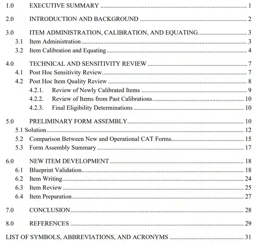 自 2008 年以来,已进行了多个阶段的研究,以开发和评估网络测试(前身为信息与通信技术素养测试,简称 ICTL),该测试被各军种用作入伍前评估,并预测网络相关军事职业入门级培训的成功率(Trippe 等人,2014 年)。直到最近,网络测试一直采用静态管理格式;也就是说,每个完成特定测试表格的考生都会以相同的顺序看到同一组项目。2018 年,人力资源研究组织(Human Resources Research Organization,HumRRO)开展了支持向计算机自适应测试(CAT)格式过渡的研究,在这种格式下,每个考生都会收到一套独特的题目,这些题目都是经过算法选择的,以优化对考生个人能力水平的估计(Koch 等人,2018 年)。这项工作的成果包括将网络测试项目库分为三个平行的 87 个项目形式(即项目库)的解决方案,CAT 算法可从中抽取项目,以及 215 个可用于试点测试的新项目。