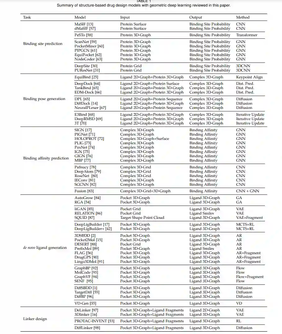 在图1中,我们展示了本论文中审查的结构基药物设计任务的概述,包括结合位点预测、结合位姿生成、全新分子生成、连接物设计和结合亲和力预测。一般来说,结合位点预测和结合亲和力预测是预测任务。其他任务是利用生成模型来处理的生成任务。在这里,我们总结了预测任务(即结合位点预测和结合亲和力预测)的主流预测方法。这些模型也广泛用作生成方法的结构编码骨干。我们总结了结构基药物设计任务中流行的生成方法,包括自回归模型、流模型、变分自编码器、扩散模型以及其他一些方法。
